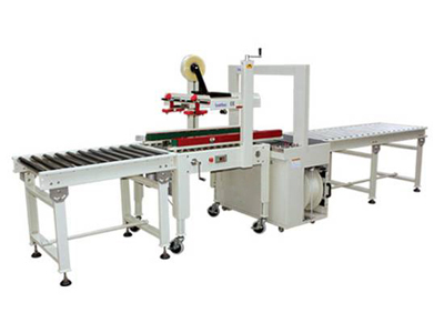 封箱機(jī)(紙箱膠帶封口)+高解析噴碼機(jī)(日期、批號(hào)、廠(chǎng)名等信息噴印打碼設(shè)備)+自動(dòng)打包機(jī)(自動(dòng)打出兩道PP帶。進(jìn)行紙箱捆扎包裝)