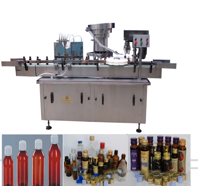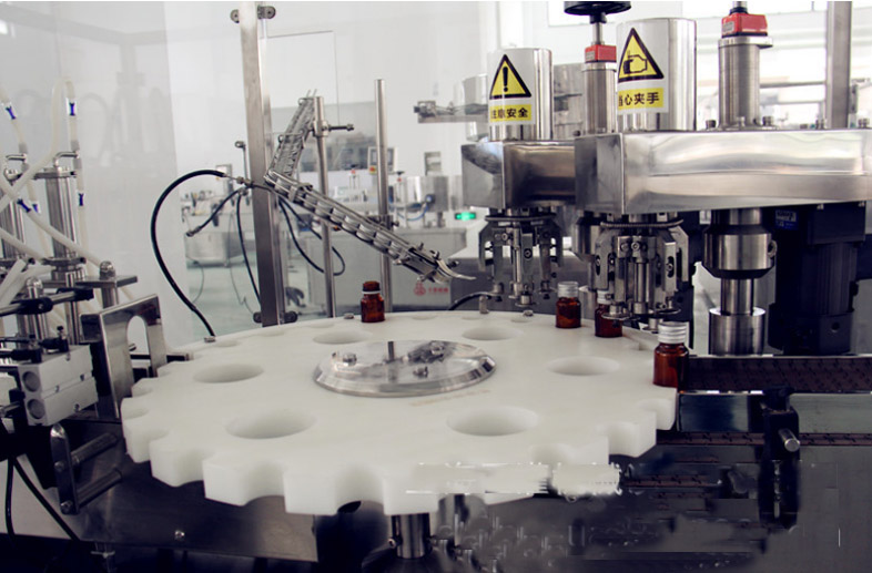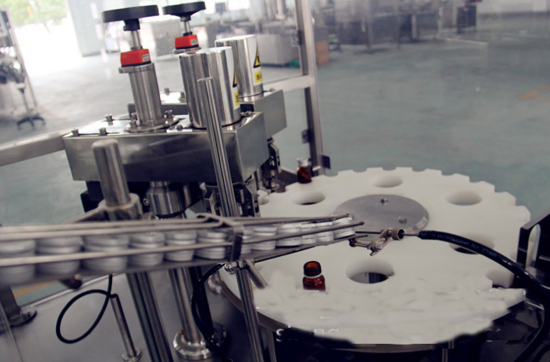 該西林瓶灌裝壓塞鎖蓋機集自動進瓶、理蓋、上蓋、抽吸真空、旋蓋、出瓶于一體,生產(chǎn)效率高,運行穩(wěn)定可靠;西林瓶灌裝壓塞鎖蓋機的真空度可按需要設定,使用旋合式旋蓋原理和全密封真空式結構;該西林瓶灌裝壓塞鎖蓋機自動化程度高,設計合理,主要是由瓶子輸送、理蓋、夾瓶掛蓋、旋蓋、電控等機構和抽真空系統(tǒng)組成;此西林瓶灌裝壓塞鎖蓋機能耗低、適應性好,旋蓋機構高度可調節(jié),適應相同口徑、不同高度的瓶子旋蓋;更換部分零件即可實現(xiàn)不同瓶徑、不同口徑的旋蓋,更換快捷方便;夾瓶子的托爪帶有膠墊,真空罩、旋蓋、配蓋機構都是氣缸驅動,在使用過程中都能做出精確調整,動作靈活;送蓋機構有光電感應安全保護裝置,可實現(xiàn)無蓋開機送蓋,蓋滿關機不送蓋;