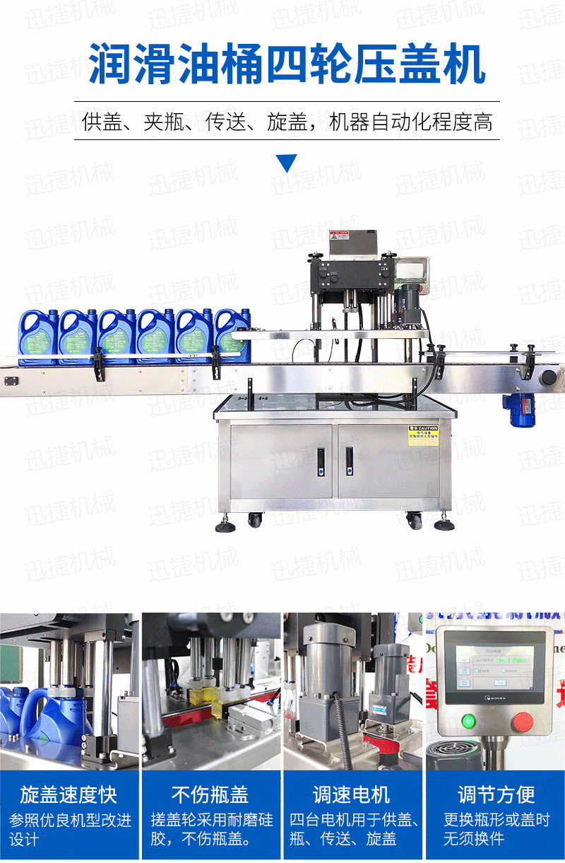 4.我們采用分系統(tǒng)動力控制及供料,提升了灌裝速度;以1L為例,4頭灌裝機(jī)每小時可達(dá)到1000桶/小時;灌裝在提升灌裝范圍的同時,對計量方式進(jìn)行了改進(jìn),大大提高了灌裝精度,誤差1‰以內(nèi)。5.灌裝頭獨(dú)有的雙重防滴漏,灌裝下料口設(shè)計精細(xì),行程短,同時也提高了整條線的灌裝速度和灌裝精度,保證在正常灌裝過程中一滴油都不會滲漏。