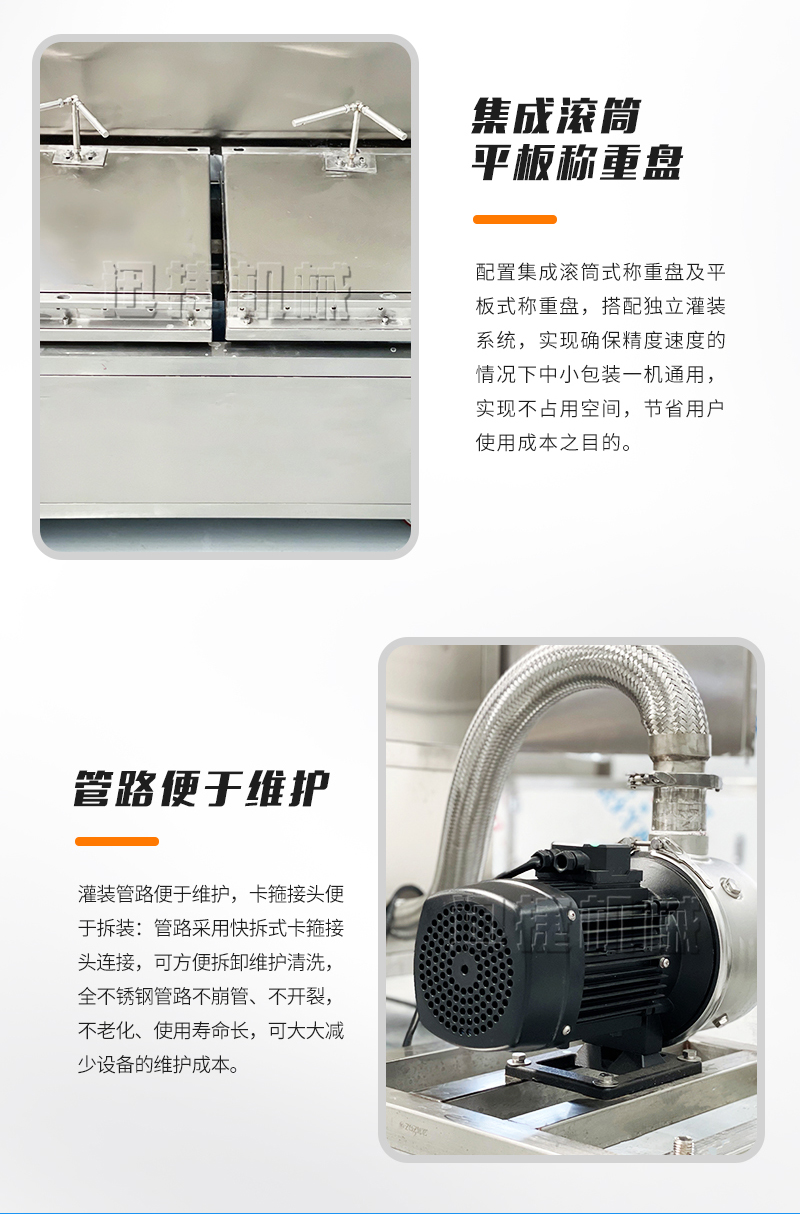 5.集成滾筒、平板稱重盤,一機多用,方便快捷:配置集成滾筒式稱重盤及平板式稱重盤,搭配獨立灌裝系統(tǒng),實現(xiàn)確保精度速度的情況下中小包裝一機通用,實現(xiàn)不占用空間,節(jié)省用戶使用成本之目的。