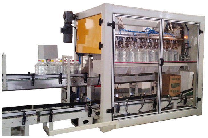 4、2.5升食用油開裝封箱包裝流水線設(shè)有多種保護(hù)功能,出現(xiàn)故障時及時停機(jī)。如:進(jìn)箱帶上不滿箱時自動停 機(jī)等待;整列機(jī)處無產(chǎn)品自動停機(jī)等待;